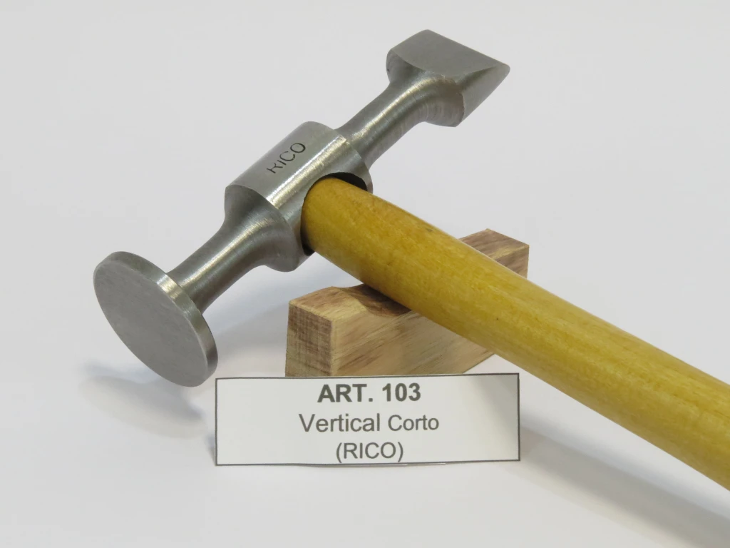 Pena vertical: Para trabajar la chapa de calibre normal, ni fina ni gruesa. Cara redonda, se utiliza para planchar la chapa siempre apoyando en la otra cara cualquier aguantador o palanca de nuestra línea que soporte el golpe y copie la forma original a la que uno desea volver. La parte con forma de hacha sin filo en posición vertical se denomina pena y es para formar las líneas, molduras o nervios de la chapa en las que solo se pueda golpear de la manera que la pena lo permita. 230 gr (12,4 cm x 28,5 cm)